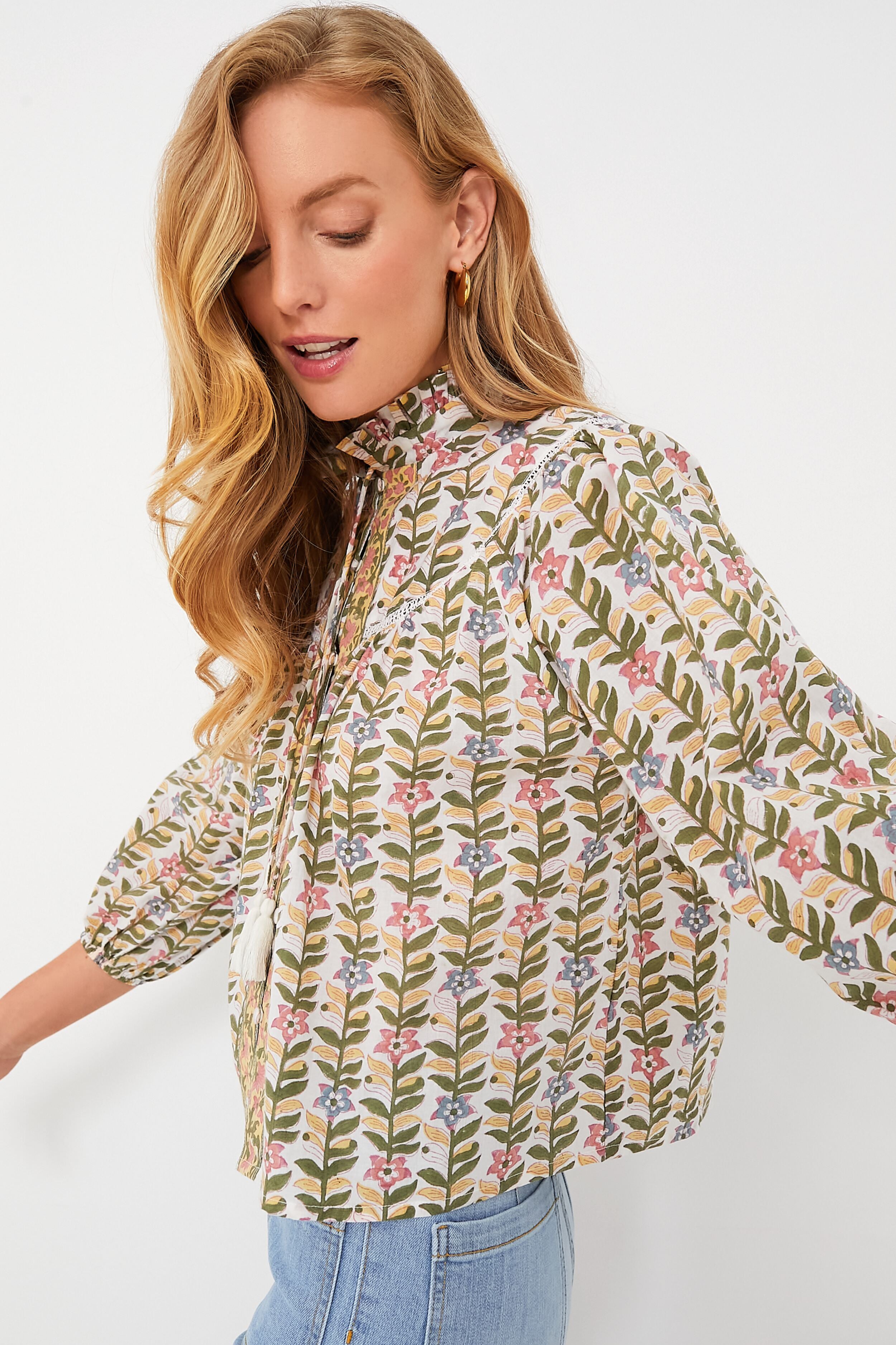 We are loving the Marigold Georgia Blouse for its floral and feminine details that make us feel like we stepped into an enchanted garden. The ruffle neckline. three-quarter length puff sleeves. and front tassel self-ties add graceful elements that complement the colorful pattern. Perfect to pair back with denim. we are styling these with everything from sneakers to ballet flats to chunky wedges!