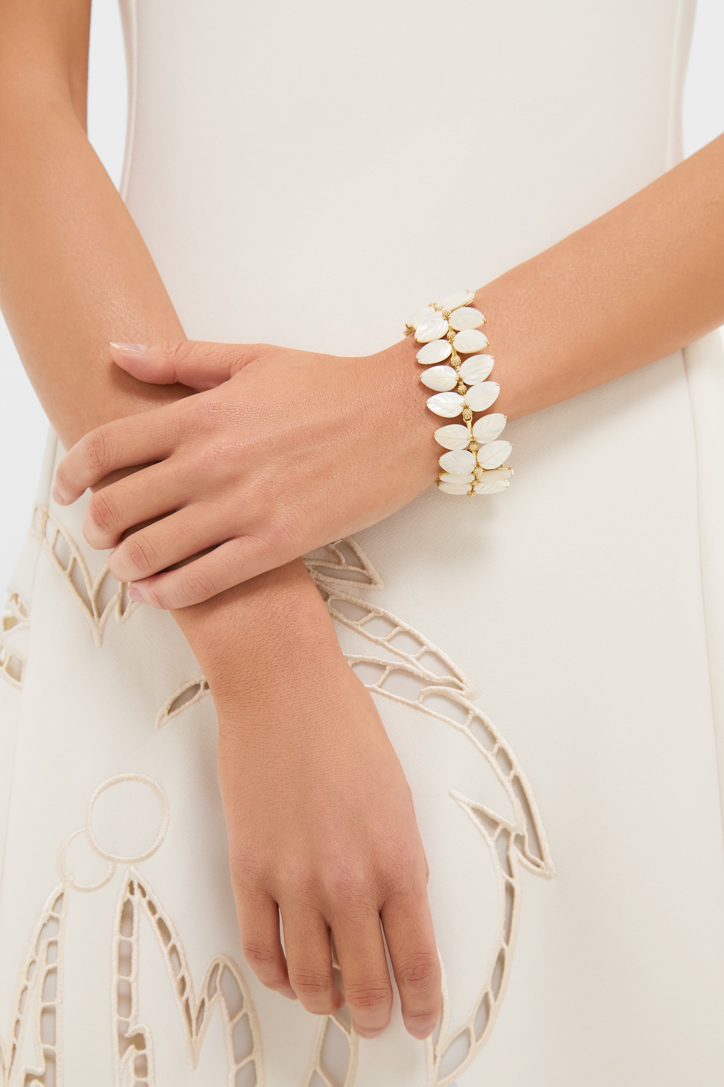 Entwine your wrist with a gorgeous vine of luminescent. hand-carved mother of pearl leaves to make a statement that is elegant. fresh with a splash of bohemian. Embellished with exquisite details like intricate carvings. golden berries and gilded leaf tips—the botanical beauty of this bracelet is the perfect outfit-finishing touch for any elevated occasion.