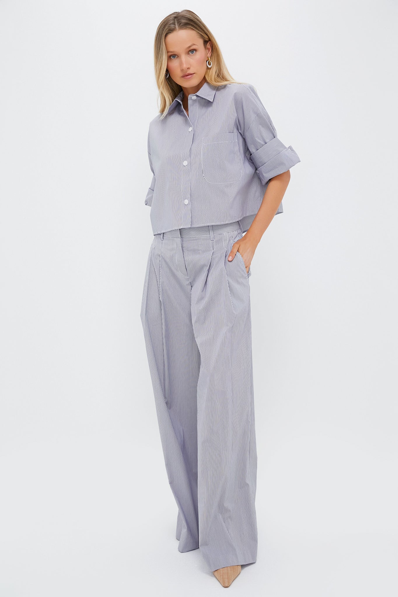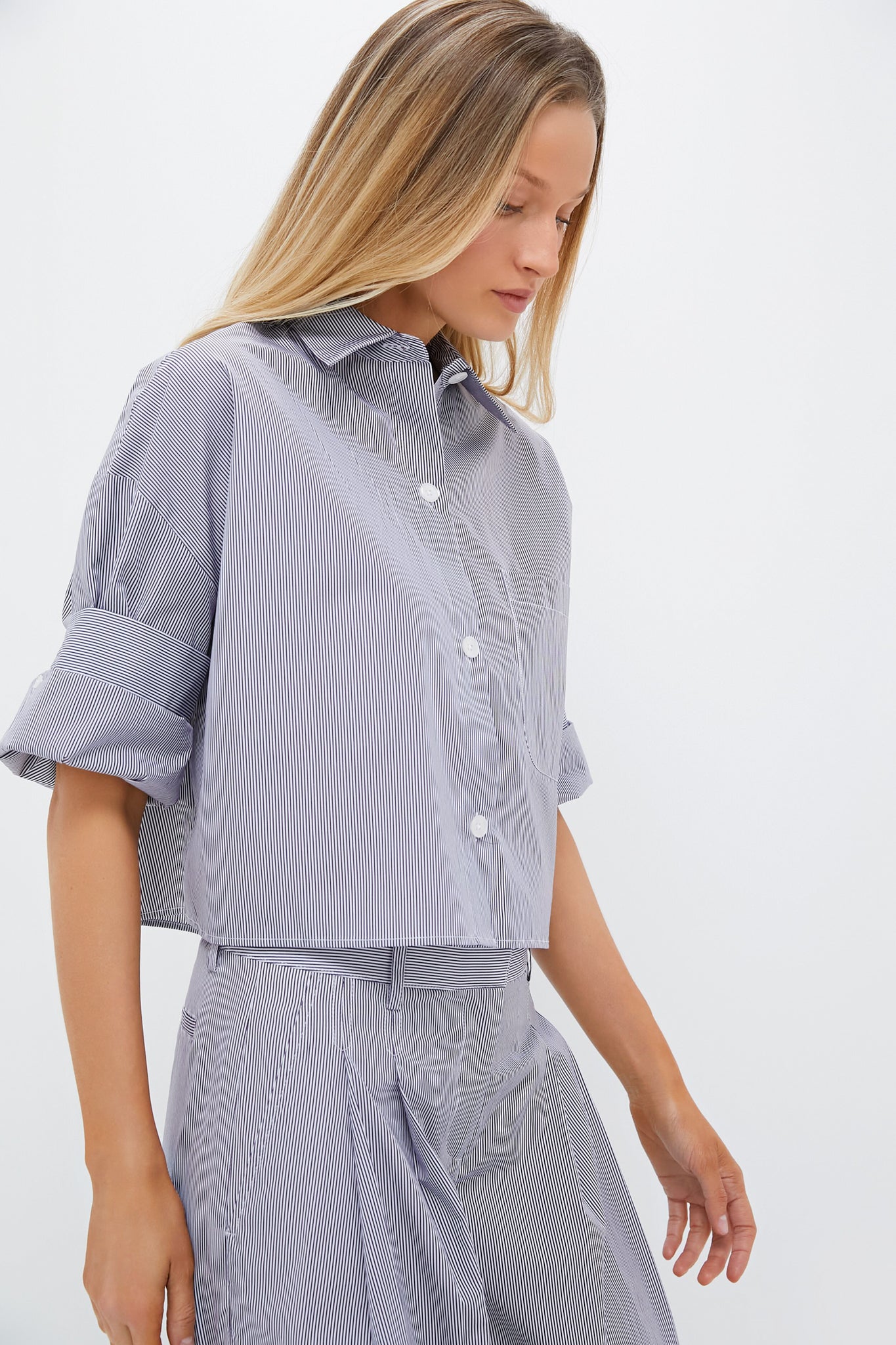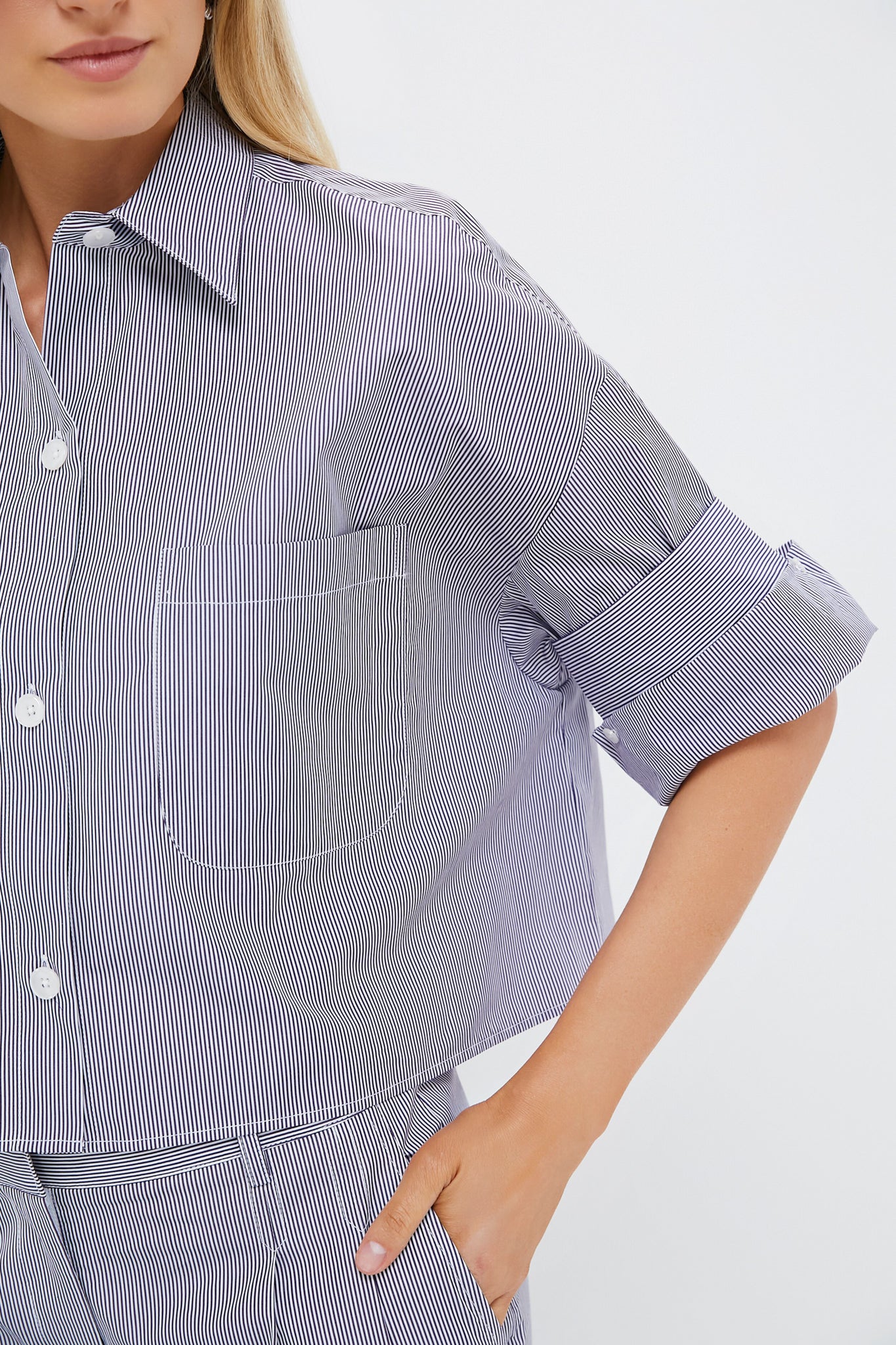 This button-down top is a cropped. boxy silhouette complete with a chest patch pocket. spread collar. and TWP's signature double roll button cuffs. Pair with denims and sneakers for a step up from casual. or with heels and the matching Midnight and White Striped New Didi Pant for an elevated set!