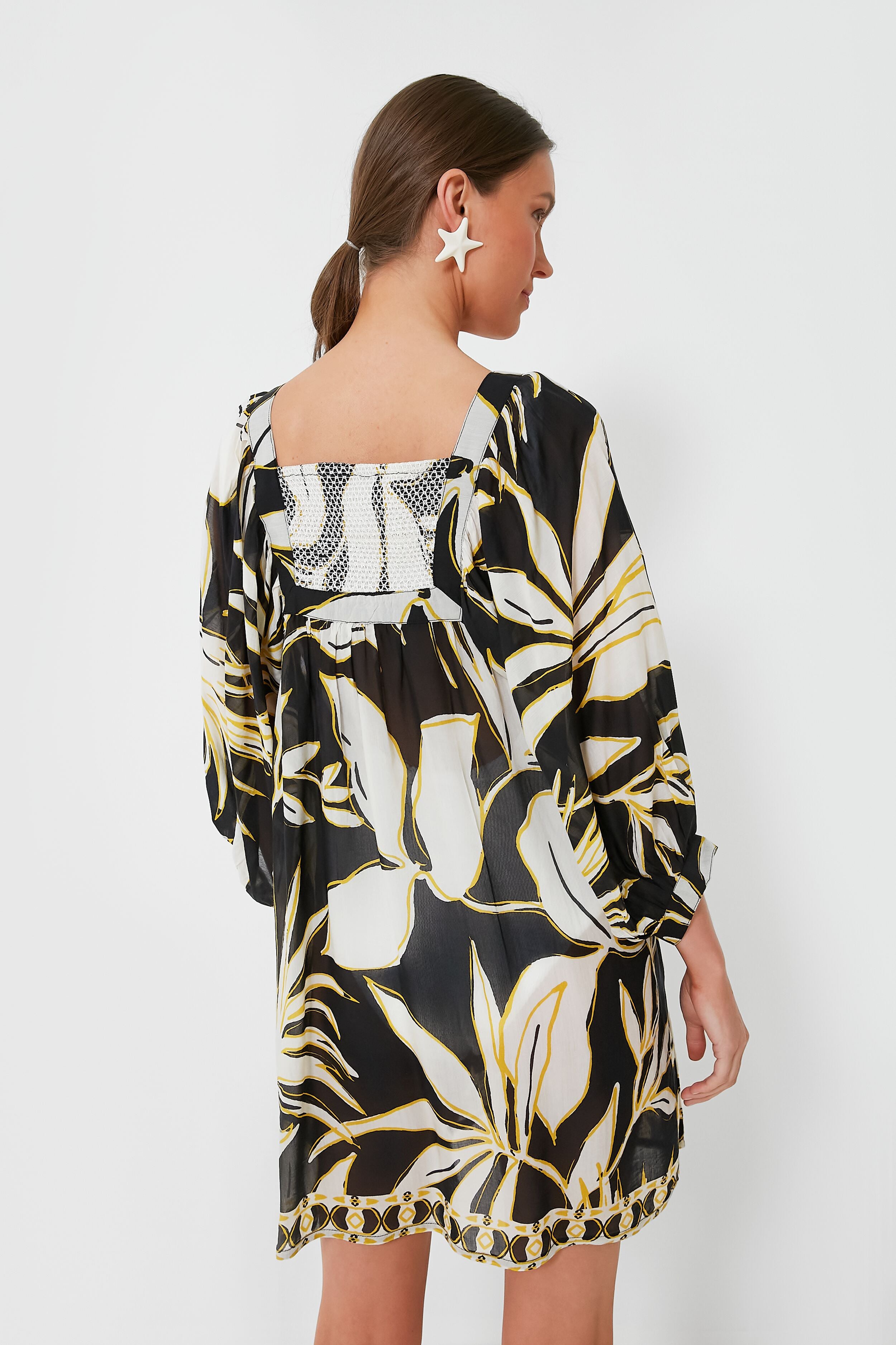 The Mod Iris Coverup is ready to soak up the sun with its fun palm print in vibrant yellow. black. and white shades! Designed with playful balloon sleeves that add to the loose and relaxed fit. this soft to the touch style is one you won't want to take off as you head from the beach to the poolside bar. Slightly sheer. we are wearing this over our favorite suit for a confidence boosting look– leaving you to just focus on relaxing.