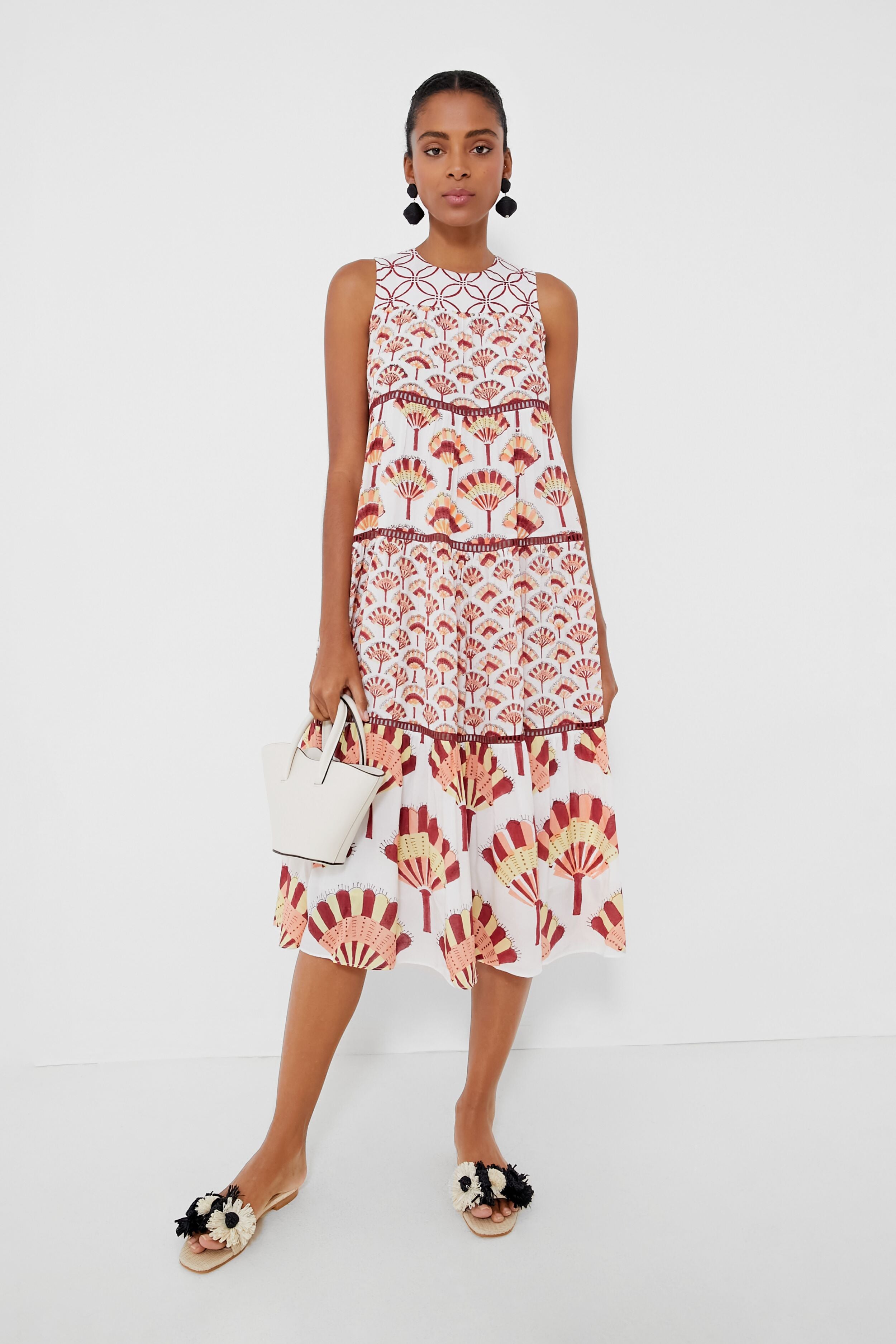 With motifs inspired by tribal paintings on palm leaves in Madagascar. the Multi Aba Dress is all kinds of vibrant and vivacious. Featuring a round neckline. a tiered body with laddering trim between. and a swingy shape made from an airy material. this sleeveless midi is begging for its moment in the sun. The perfect silhouette to pack in your bag for warm weather getaways. this fabulous frock can be dressed down with sneakers and sunnies to see the sites. or dressed up with strappy sandals and gold jewelry for a romantic dinner.