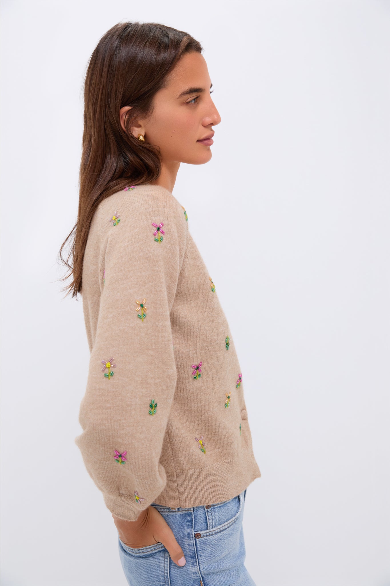 This cardigan feminine take on a classic silhouette. This elegant style features long balloon sleeves. embroidered floral motifs throughout the front. and self-covered buttons for styling versatility. A perfect transition piece from the cold-weather months to the warm-weather. you can pair this sweater with denim and a tee or with a shirt and boots!