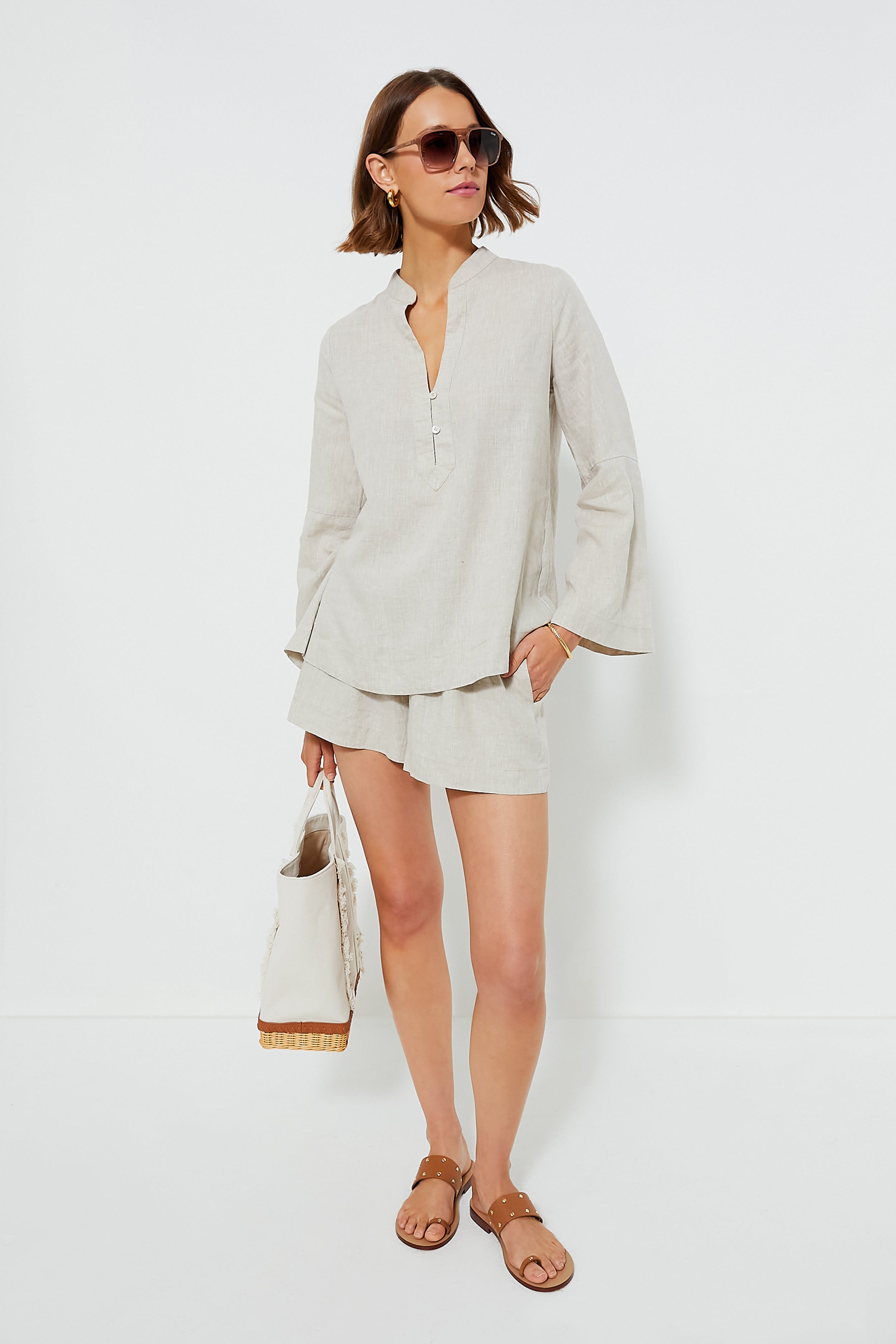 Introducing the Linen Tatum Popover- a breezy top that you can easily dress up or down for countless occasions. This blouse features long bell sleeves. a mandarin collar with a V-notch. and a two-button placket. Pair with trousers and ballet flats for work. or with the matching Linen Elena Shorts and sandals for a casual weekend look.