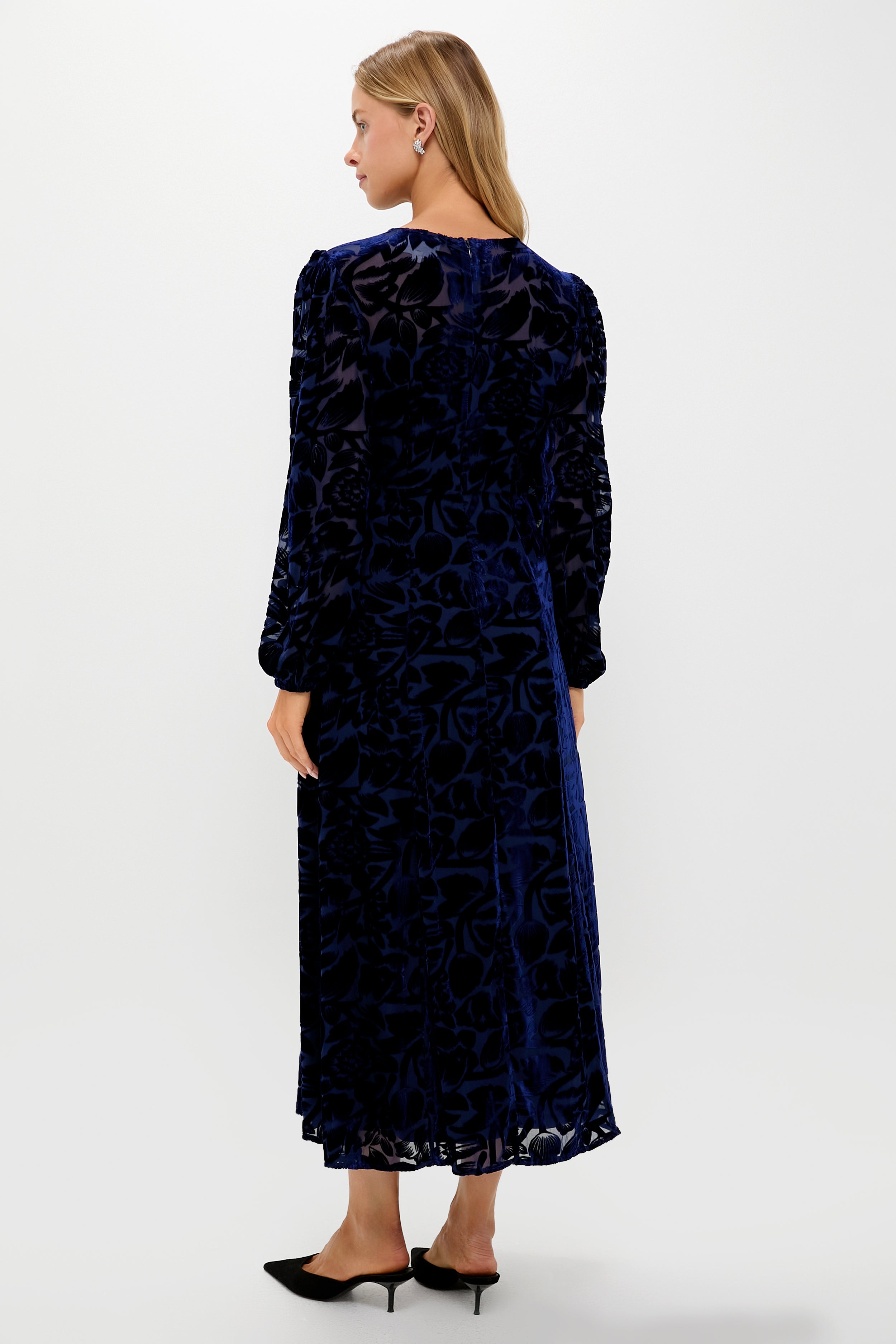 The Odette dress is a romantic style with long blouson sleeves and a sleek silhouette. elevated with midnight navy florals in a soft velvet. Style with black heels and a clutch for a chic wedding guest or cocktail party look.