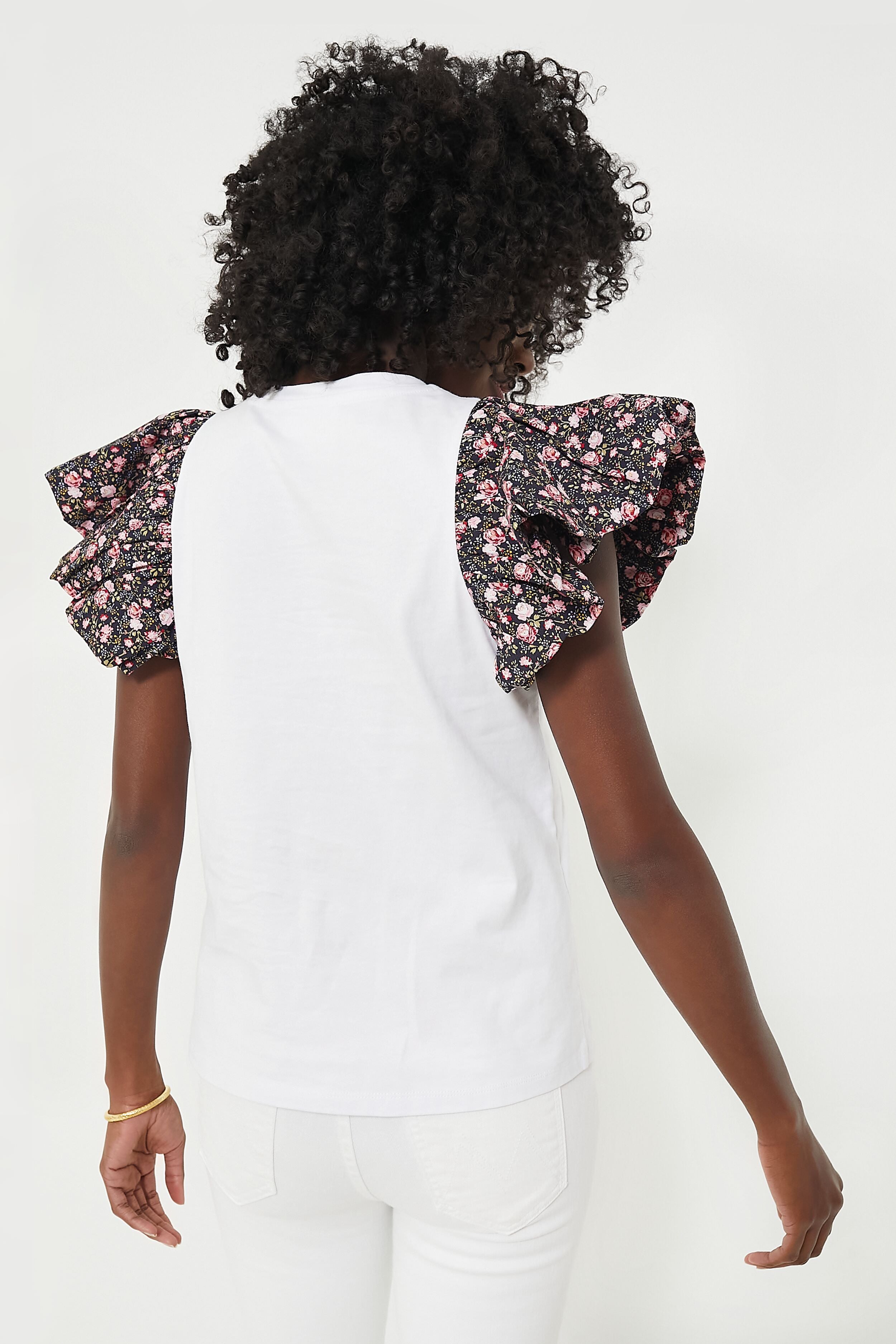Your favorite silhouette is upgraded in the Navy Floral and White Shelby Tee. With a soft cotton t-shirt body and contrasting flutter sleeves. this top is perfect for days where you want a no-fuss style that is comfortable and easy while also being elevated. Simply pair with denim and ballet flats or shorts and sneakers for an adorable daytime look.