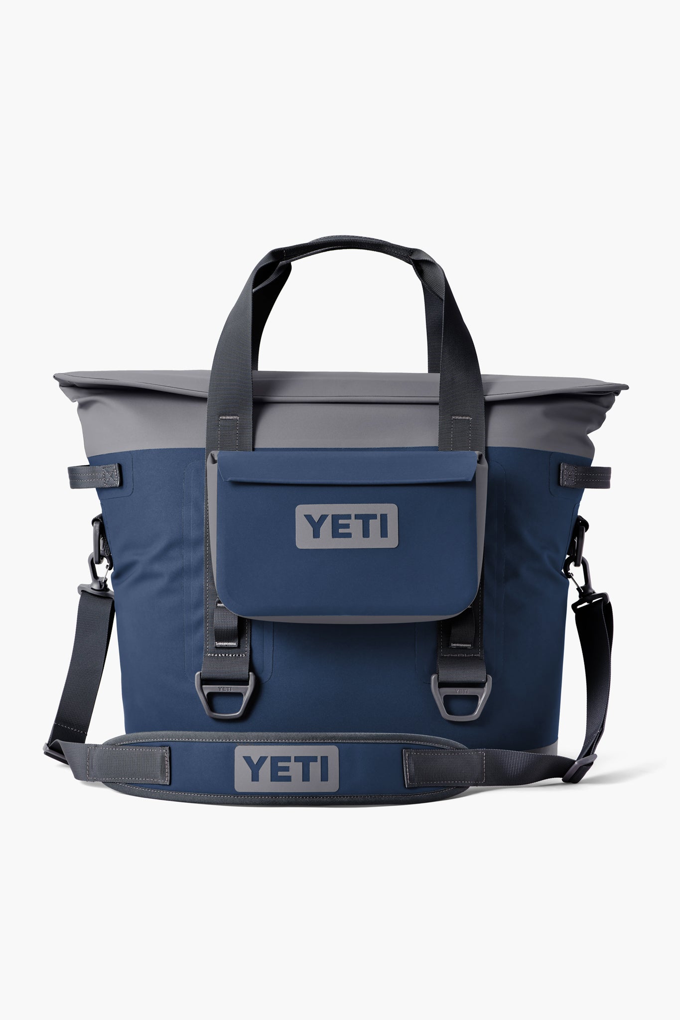 The carry-the-day. tough-as-nails Hopper soft cooler's opening has a wide mouth for easy loading and unloading. It closes almost on its own with HydroShield™ Technology – a strip of ultra-strong magnets – then is secured with two Quick-Release Buckles to ensure it can withstand being tossed around.