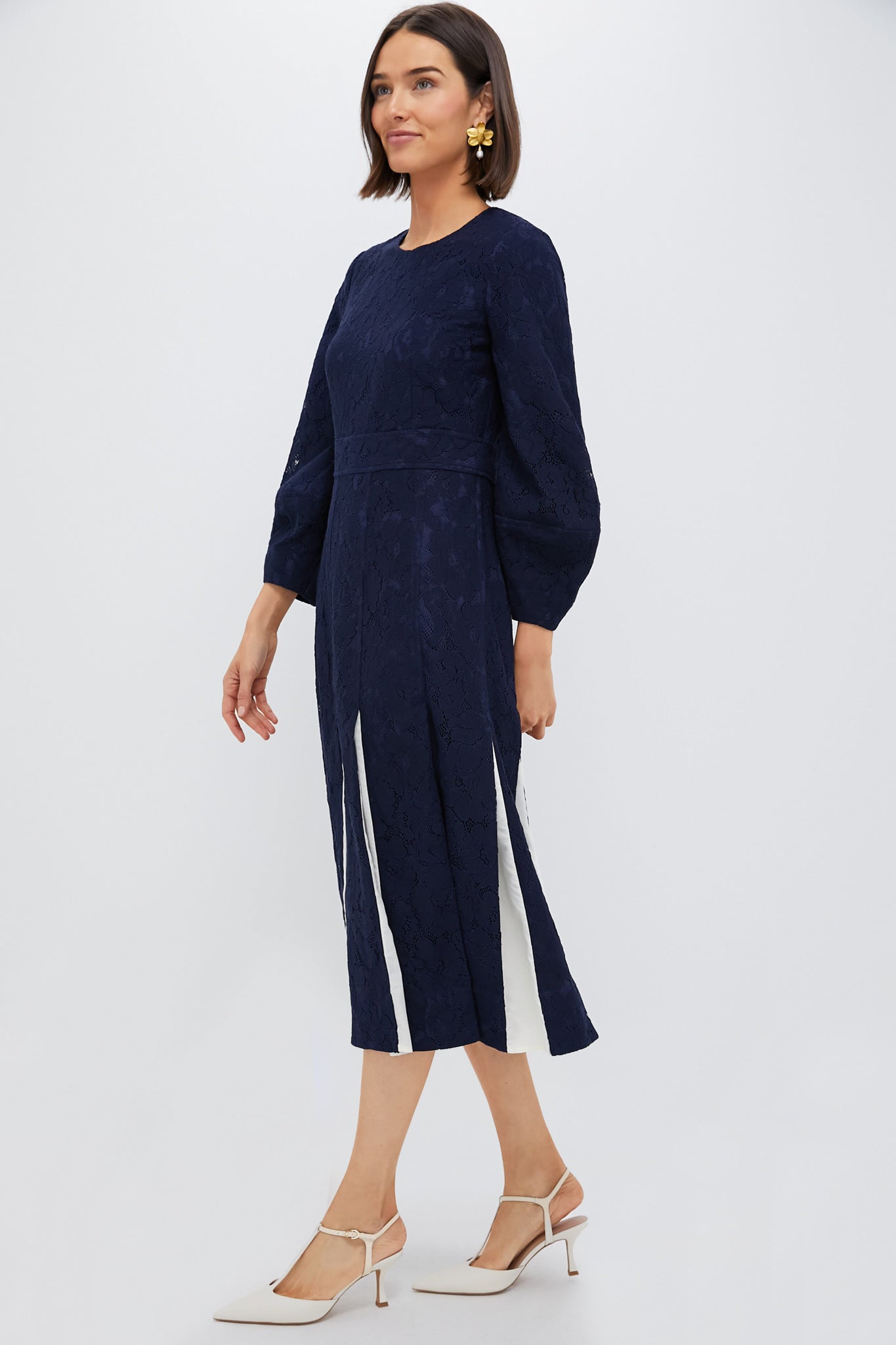 The Cristiana Dress is a timeless silhouette with long blouson sleeves and a pleated skirt with contrast godets. The navy lace creates an elegant look that will pair perfectly with simple heels and crystal studs for cocktail parties and dinner gatherings alike!