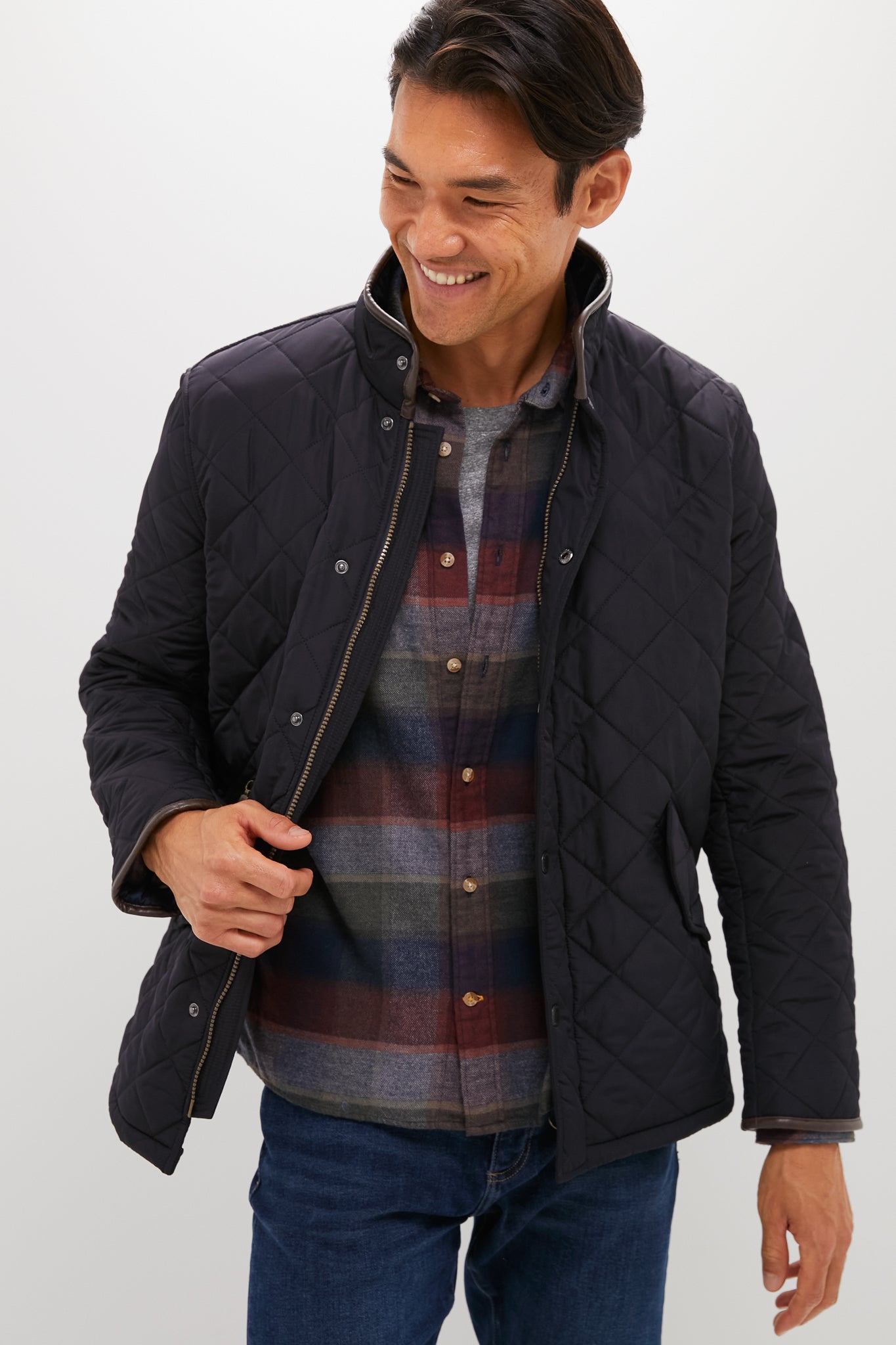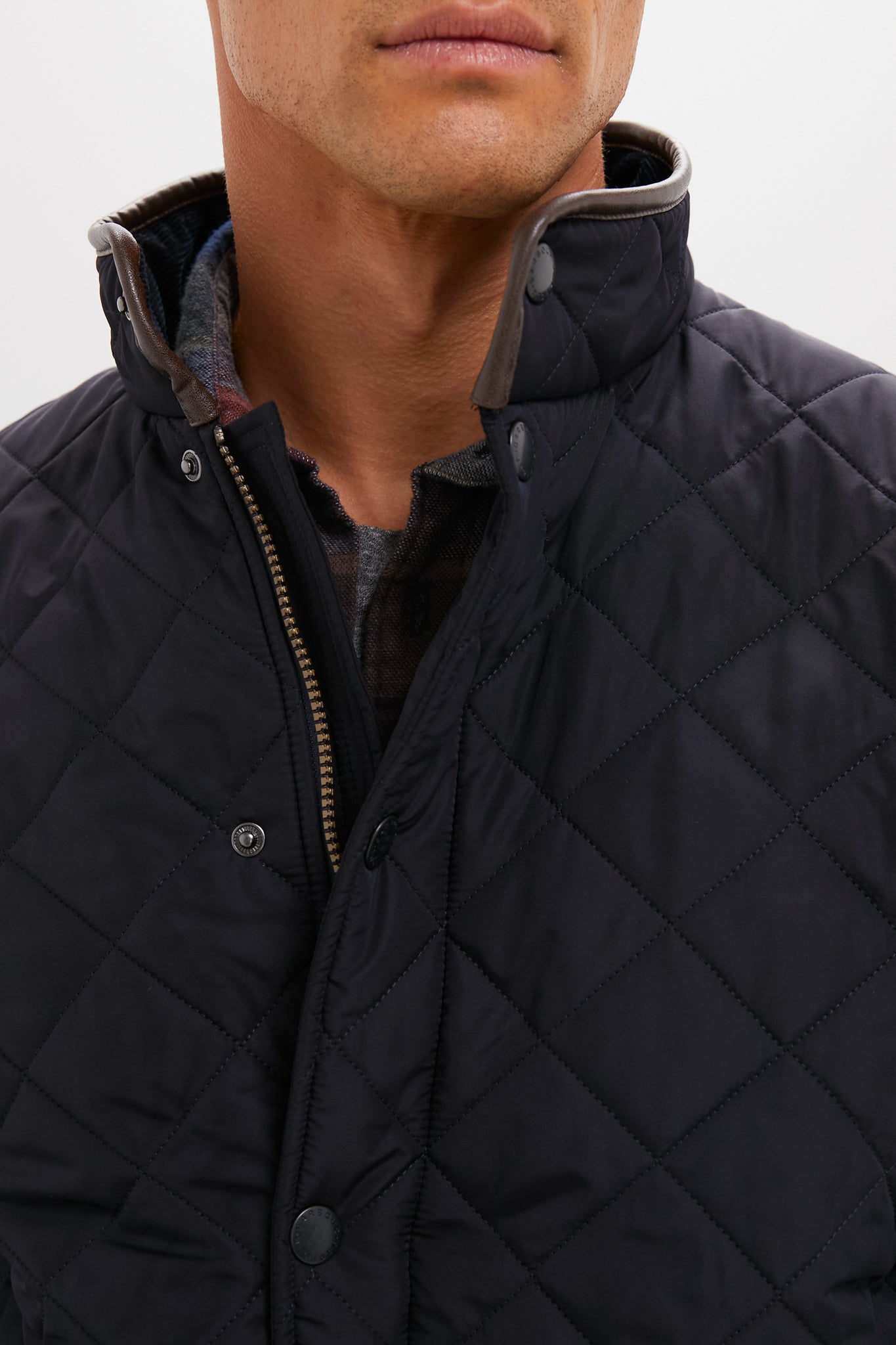 Featuring sleek diamond quilting. a leather-trimmed stand collar and cuffs. and a front zip with a snap placket. the Powell Quilted Jacket is timeless and practical for cool weather. Lightweight yet warm. this easy outer layer will take you everywhere from brisk walks to sporting events in style. Wear it over a tee with sneakers for off-duty weekend looks. or over a sweater with a beanie as the temps drop.