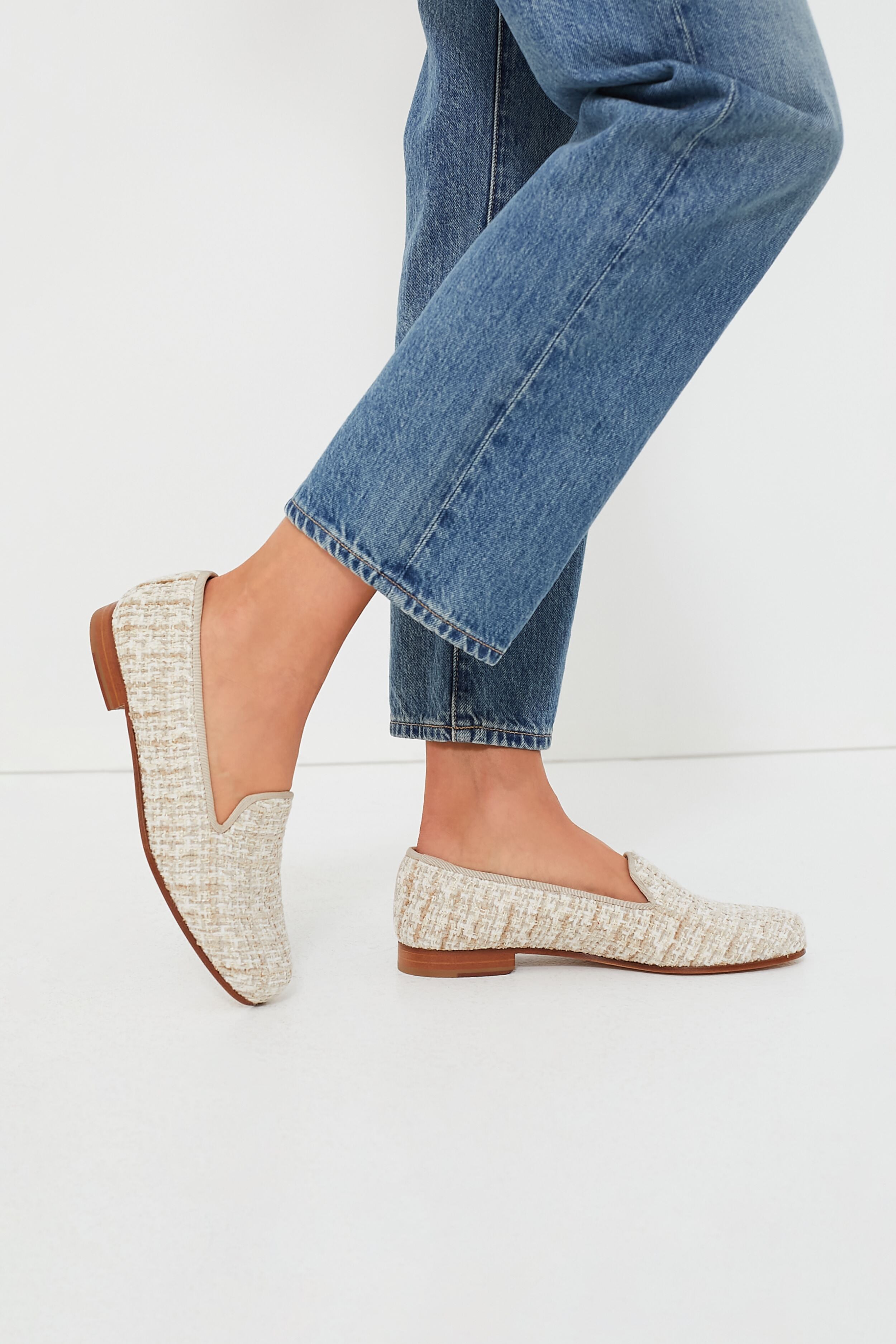 - Material: Tweed (upper). Grosgrain Ribbon (trim). Leather (lining and outsole)